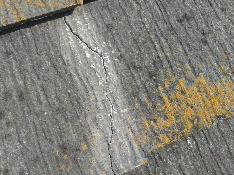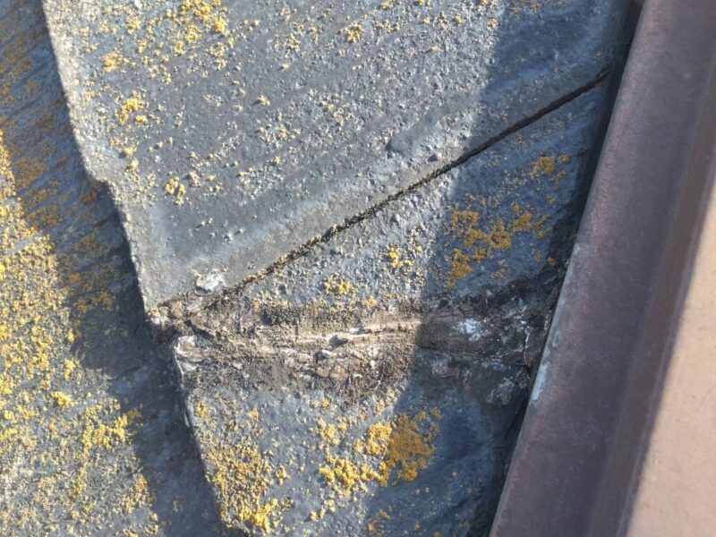 - 広範囲にわたるひび割れ(クラック): 複数の瓦に縦方向のひび割れが確認され、ここから雨水が浸入していると推測されました。